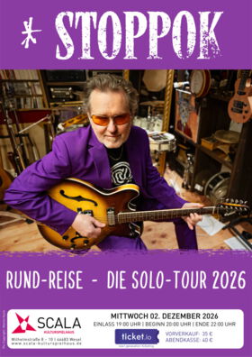 Reisen bildet. Diese „RUND-Reise“ erst recht. STOPPOK, der geistreiche Seismograph unseres Landes, hat 2026 einen runden Geburtstag, wird 70. Das ist zu schön, um nicht gefeiert zu werden. Auf einer „RUND-Reise“ durch die Republik, auf den Live-Bühnen des Landes. seit jeher STOPPOKs Emotions-Revier und natürliches Biotop. Also rein in die Jubel-Touren mit Ecken und Kanten, mit Herz und Hirn, mit neuem Album und alten Freunden. Die Text-Gesangs-Gitarre-Ikone präsentiert sich in lässigster Geburtstagslaune.